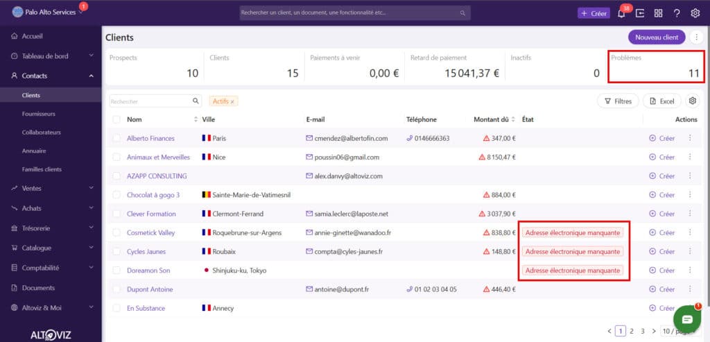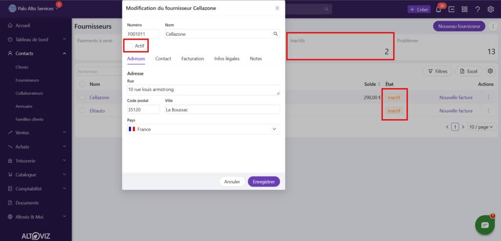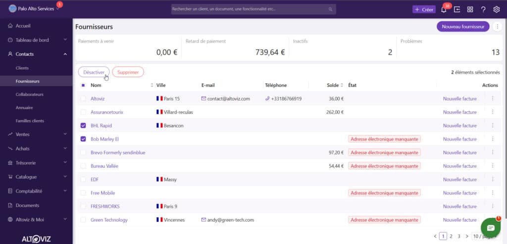 L’app Altoviz vous permet de désactiver les clients, produits/services et fournisseurs, sans les supprimer. Ils n’apparaîtront plus dans les listes de choix (ex : saisi d’un client ou d’un produit dans un devis) mais resteront disponibles pour consulter les historiques et les statistiques.
