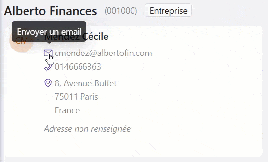 Un champs adresse électronique dédié fait son apparition dans les fiches clients et fournisseurs. Il vous permet d’indiquer une adresse spécifique, dans le cas où celle-ci ne correspondrait pas exactement au SIREN de l’entreprise.